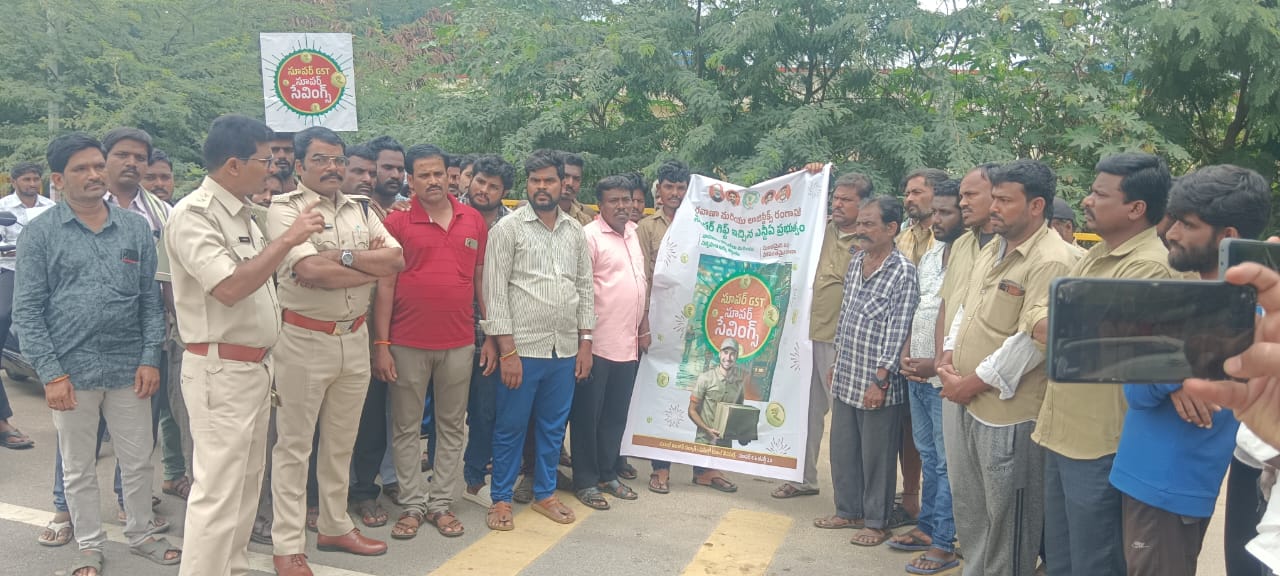 సాక్షి డిజిటల్ న్యూస్ : 16 అక్టోబర్ 2025 తంబళ్లపల్లి నియోజకవర్గ ఇన్చార్జి రమేష్ బాబు ( రాము) వార్త విశ్లేషణ అన్నమయ్య జిల్లా తంబళ్లపల్లి నియోజకవర్గం మొలకలచెరువు మండల మూడు రోడ్ల కూడలి నందు జిఎస్టి తగ్గింపు పై అవగాహన కార్యక్రమాన్ని నిర్వహించిన ఆర్టీవో శివలింగయ్య. కార్యక్రమంలో భాగంగా శివలింగయ్య మాట్లాడుతూ జీఎస్టీ తగ్గింపు అంటే ప్రతి వాహనం కొనుగోలుపై మరియు ప్రతి నిత్యవసర వస్తువు కొనుగోలుపై 26% జీఎస్టీ ఉన్న వస్తువు 13% కు తగ్గించారని జీఎస్టీ తగ్గింపు వల్ల వాహన కొనుగోలుదారులకు ఎక్కువ లాభాలు చేకూరుతాయని అన్నారు. కార్యక్రమంలో శివలింగయ్య తోపాటు హెడ్ కానిస్టేబుల్ రమణ, మండల సెక్రెటరీ, ఆటో యూనియన్ లీడర్స్ మహమ్మద్ రఫీ, కట్టుబడి మా భాష , ఖాదర్ బాషా, కాసిం, రియాజ్, మహేష్, కుట్టి, నరేష్, రాళ్లపల్లి బావాజీ, అస్రఫ్, ఫిరోజ్, బావ, శంకర్, చల్ల, సైదు, చాను, మౌలా, మున్నా, మాలిక్ షేక్ అయీ భాష,తదితరులు ఆటోలతో ర్యాలీ నిర్వహించి కార్యక్రమాన్ని జయప్రదం చేశారు.