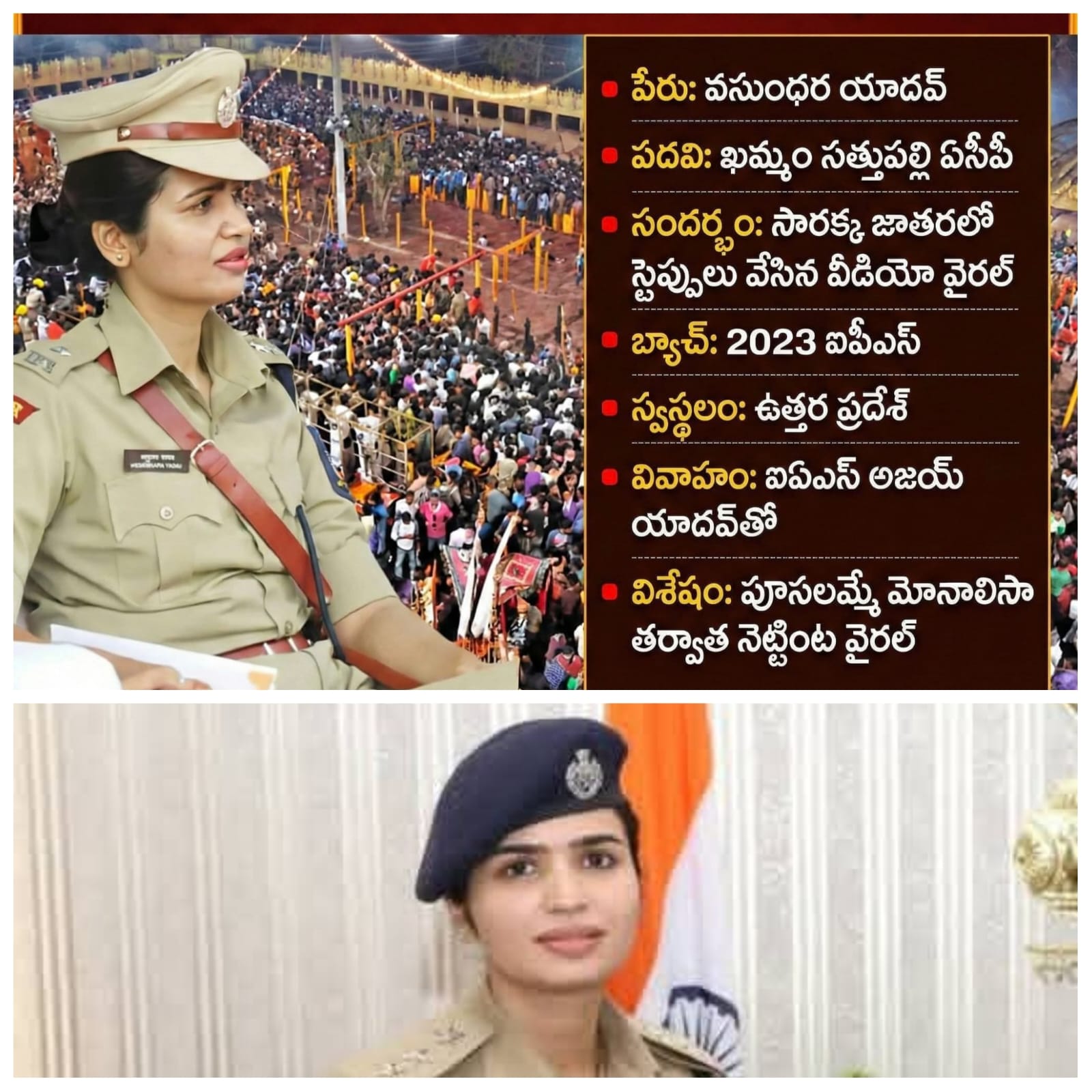 తెలంగాణ కుంభమేళాగా పేరొందిన, ఆసియాలోనే అతిపెద్ద గిరిజన జాతర అయిన మేడారం సమ్మక్క–సారలమ్మ జాతర అంగరంగ వైభవంగా కొనసాగుతోంది. జనవరి 28న ప్రారంభమైన ఈ జాతర జనవరి 31 వరకు జరిగింది, కీలక ఘట్టాలన్నీ విజయవంతంగా పూర్తయ్యాయి. గిరిజన పూజారులు సమ్మక్క, సారలమ్మను గద్దెలపైకి తీసుకురావడంతో జాతర పరాకాష్టకు చేరింది. అడవి తల్లులను దర్శించుకునేందుకు లక్షలాది మంది భక్తులు మేడారం బాట పట్టారు.ఇదిలా ఉండగా, ఈసారి మేడారం జాతరలో ఓ లేడీ ఐపీఎస్ అధికారి ప్రత్యేక ఆకర్షణగా నిలిచారు. జాతర విధుల్లో ఉన్న ఆమె ఫొటోలు, వీడియోలు సామాజిక మాధ్యమాల్లో వైరల్గా మారి నెట్టింట సెన్సేషన్గా నిలుస్తున్నాయి. ఖమ్మం జిల్లా కల్లూరు ఏసీపీగా విధులు నిర్వహిస్తున్న వసుంధర యాదవ్ ఈ జాతర భద్రతా ఏర్పాట్లకు నాయకత్వం వహిస్తున్నారు. యూపీ నేపథ్యంతో తెలంగాణ క్యాడర్కు చెందిన ఐపీఎస్ అధికారిణిగా ఆమె చురుకుదనం అందరి దృష్టిని ఆకర్షిస్తోంది.సమ్మక్క రాక సందర్భంగా జిల్లా ఎస్పీతో కలిసి భద్రతా ఏర్పాట్లను సమర్థవంతంగా పర్యవేక్షించిన వసుంధర యాదవ్, ఉత్సవ స్ఫూర్తిని ప్రతిబింబించేలా కనిపించారు. తుపాకీతో గాల్లో కాల్పులు జరిపిన సమయంలో ఆమె చూపిన ఉత్సాహం, కేరింతలు, సారలమ్మ గద్దెల వద్ద మంత్రి సీతక్కతో కలిసి వేసిన స్టెప్పులు వీడియోలుగా మారి సోషల్ మీడియాలో హల్చల్ చేస్తున్నాయి. ఈ దృశ్యాలు లక్షలాది వ్యూస్ సాధిస్తూ నెటిజన్లను ఆకట్టుకుంటున్నాయి.